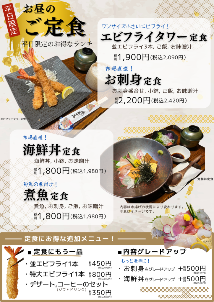 【平日】お昼の定食始めました! 平日限定でお昼の定食はじめました! ひらめ亭自慢の味を定食でご用意。 ・エビフライタワー定食・お刺身定食・海鮮丼定食・煮魚定食 定食にお得な追加メニューもございます!【お昼のランチ/定食】詳細はコチラ 平日だけのお得なメニュー、ぜひご堪能ください。
