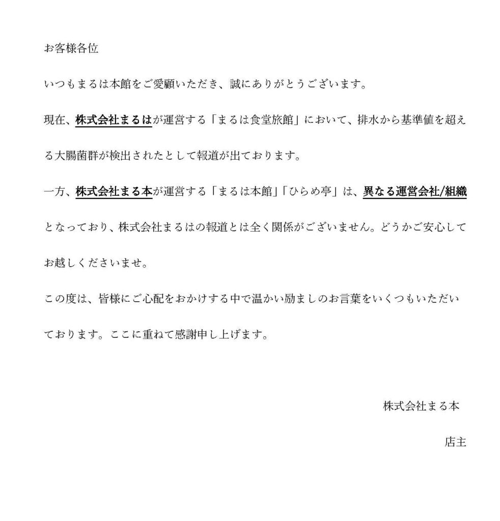 いつもひらめ亭をご愛顧いただき、誠にありがとうございます。現在、株式会社まるはが運営する「まるは食堂旅館」において、排水から基準値を超える大腸菌が検出されたとして報道が出ております。